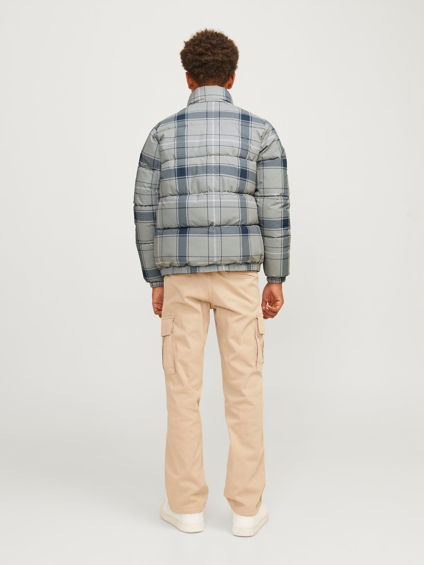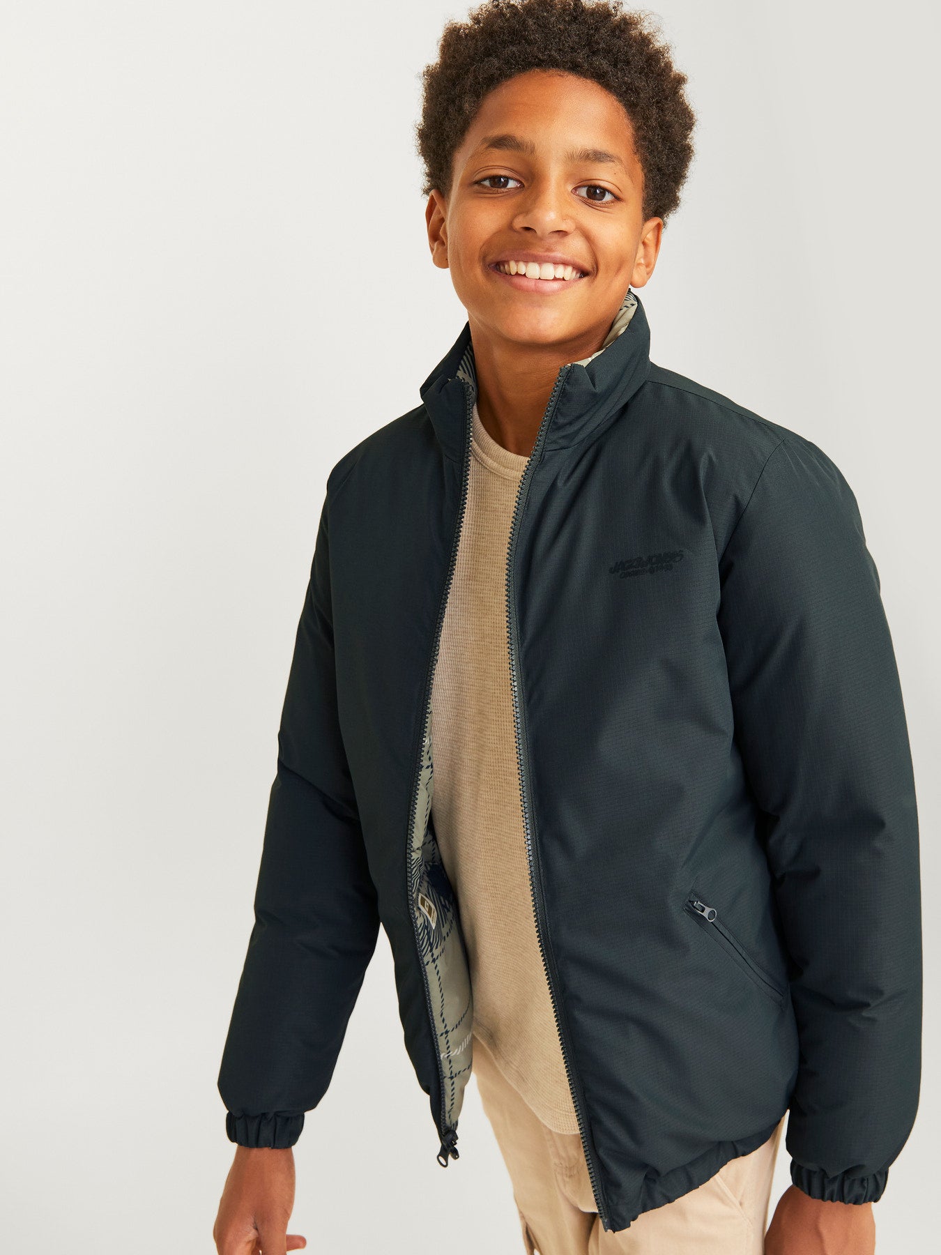 Na cor Forest River, um tom verde profundo e moderno, o casaco apresenta um lado liso e outro com estampa em padrão quadriculado nos mesmos tons, permitindo criar looks diferentes conforme a ocasião. O enchimento leve proporciona aquecimento sem pesar, ideal para o dia a dia ativo das crianças.